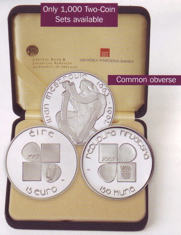 Silver Proof €15 coin celebrates the 80th anniversary of the original coin design Girl with Harp which was gifted to the Irish State by Ivan Mestrovic in 1927. This design was submitted by the artist as an entry in the competition for the design of the 1928 Irish Free State coinage. Unfortunately, because of difficulty contacting him (he was in the United States) his design arrived too late for consideration. The Chairman of the Design Committee, a famous Irish poet William Butler Yeats, subsequently wrote “He made one magnificent design and, on discovering that the date had passed, gave it to the Irish Free State with great generosity”. It has been used as the seal of the Central Bank of Ireland since 1965. Alongside the €15 Silver Proof Coin being issued in Ireland, there is an almost identical 150 Kuna Silver Proof Coin being issued by the Croatian National Bank. Both coins bear an identical obverse, the beautiful “Girl with Harp” design by Ivan Me±trovic. (source: Central Bank of Ireland)