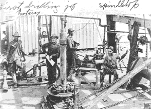 …This picture was taken four days after the oil began to gush. The well went wild for ten days, pouring approximaly 800,000 barrels of oil, and making an oil lake covering some 100 acres of land, before Captain Lucas was able to cap it. Great quantities of oil went as far as Port Arthur, sixteen miles below, on the coast. see [Soric, p 97])