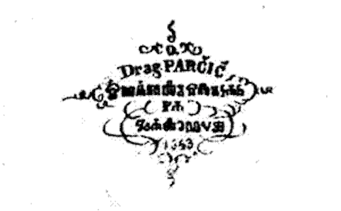 His probably most interesting work is the Glagolitic Missal that he prepared for the needs of the Croatian Glagolitic Liturgy, published in Rome in 1893. See an article by Igor Gostl for more details (in Croatian), or his book. Parcic was also one of the first Croatian photographers. Here is his seal from his photo, written in part in Croatian Glagolitic Script:
