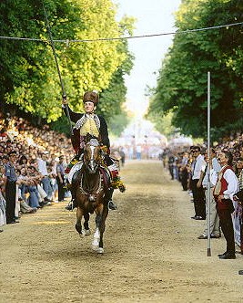 Sinjska alka (The Sinj Alka) is a competition to the memory of the legendary 1715 victory over the Turks, where the town of Sinj near Split has been saved. According to the legend, the victory was attained due to the help of the Lady of Sinj (Gospa Sinjska). The aim of the competition, organized August 15th each year since 1715, is to pierce the ALKA with a spear, riding a horse at full speed (45 km/h). The alka is hanged on the rope at the hight of 3,22 m.