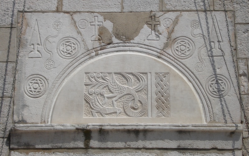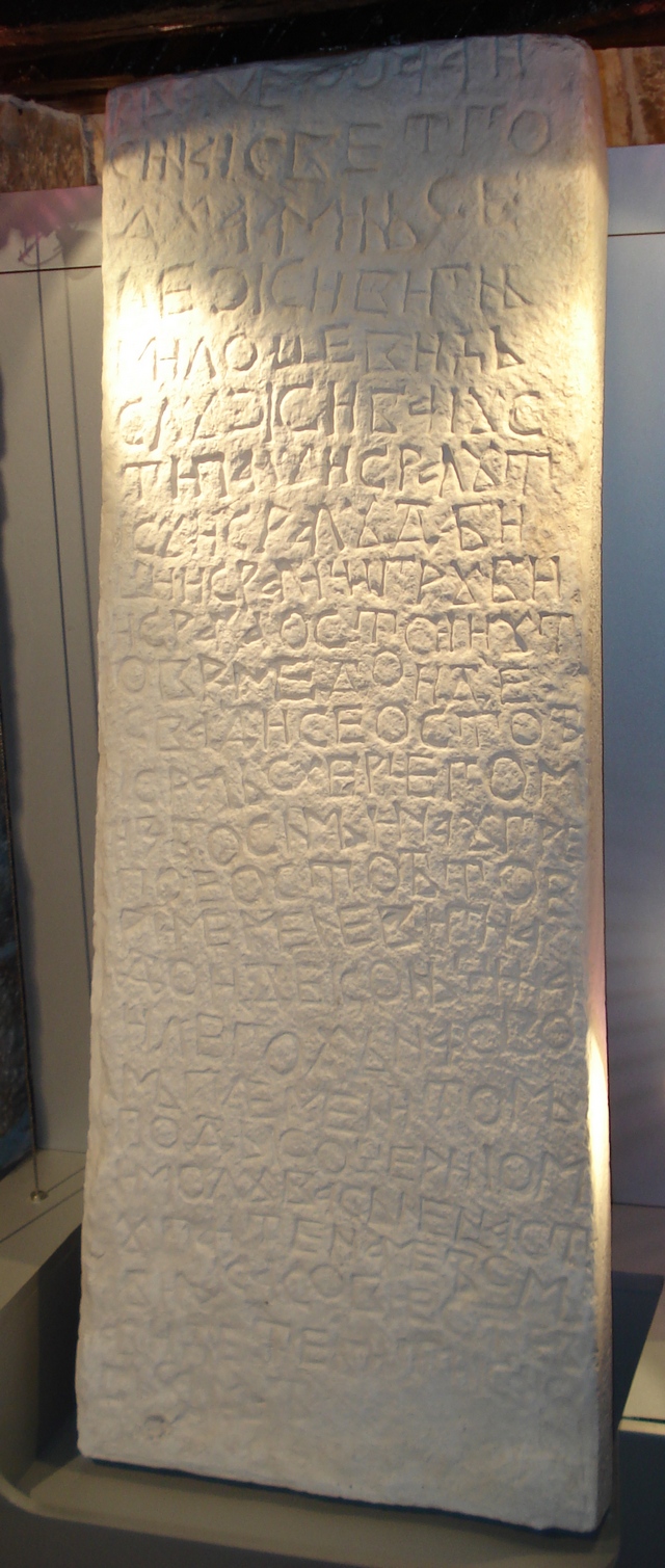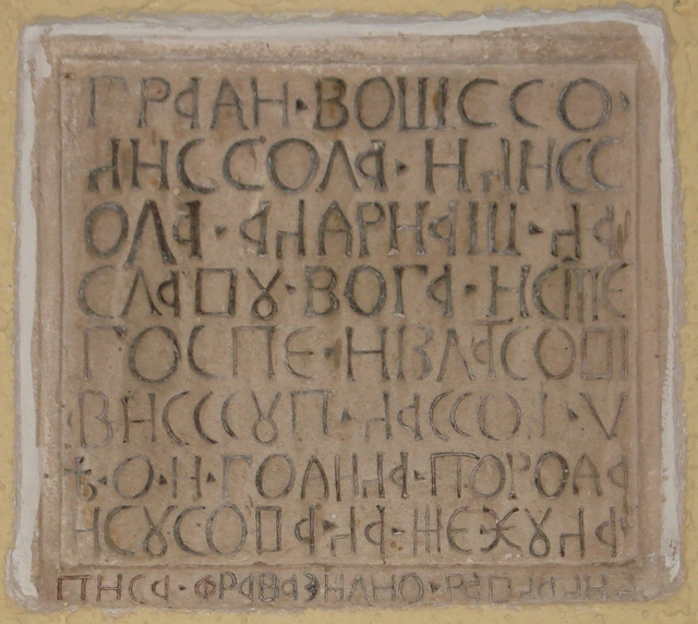 - the Croatian Cyrillic inscription of the Povlja lintel (1184) from the Benedictine monastery in the village of Povlja on the island of Brac near Split;