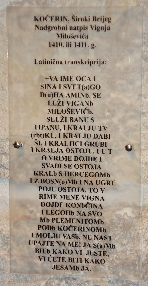 - Kočerin tablet from 1410 or 1411 (carved in stone in Kočerin near Siroki Brijeg), with about 300 Croatian cyrillic letters (this the largest known text in Croatian Cyrillic appearing on stecak’s); the text is written in ikavian dialect, and starts with invocation of Holy Trinity: Va ime Oca i Sina i svetoga Duha, Amin, se leži Viganj Milošević…, and the concluding message is indicative: I molju vas ne nastupite na me! Ja sam bil kako vi jeste, vi ćete biti kako jesam ja (“And I ask you not to step on me, I was like you, and you will be like me”)