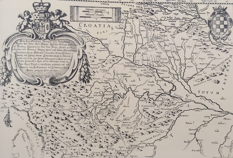 To the most illustrious and noble lord, Prince Peter of Zrin, the ban of the Kingdom of Dalmatia, Croatia and Slavonia, hereditary ban of the Littoral, hereditary captain of the Legrad fortress and Medimurje peninsula, master and hereditary prince of Lika, Odorje, Krbava, Omis, Klis, Skradin, Ostrovica, Bribir etc.., Master of Kostajnica and the sliver mine at Gvozdansko, councillor and chamberlain to his anointed imperial majesty, master Ioannes Blaeu dedicates this map.