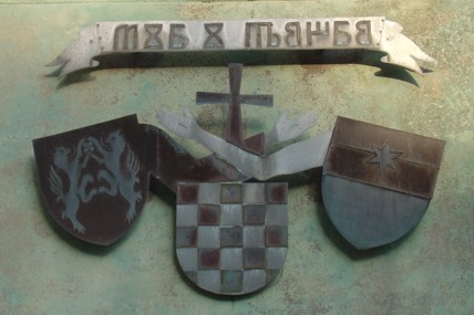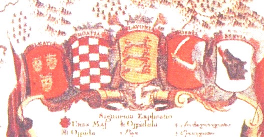 On the left, Coats of Arms of Dalmatia (three leopards), Croatia, Bosnia (hand with a sward) and Slavonia.