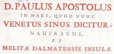 A detail from the title page of Ignjat Djurdjevic indicating Melitae Dalmatensis Insulae (i.e. Dalmatian island of Mljet) as the place of St. Paul’s shipwreck, and not Malta which is in the Lybian Sea.