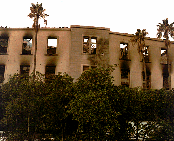 In a fire caused by missiles fired at the building disappeared the valuable library with collection of 25,000 volumes of books and 205 periodicals. See [Wounded Libraries in Croatia, p. 48]. See destroyed Dubrovnik roofs: roof1 and roof2.