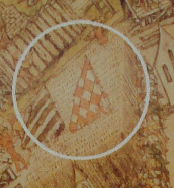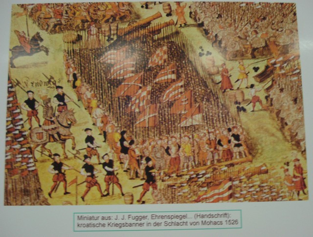Two clearly visible Croatian Coats of Arms of Croatian troups at the 1526 battle at the Mohac field (Hungary) against the Turks (the second flag in the left column and the fourth flag in the right column). By the courtesy of Josip Sersic and Mijo Juric, Vienna, 2009.